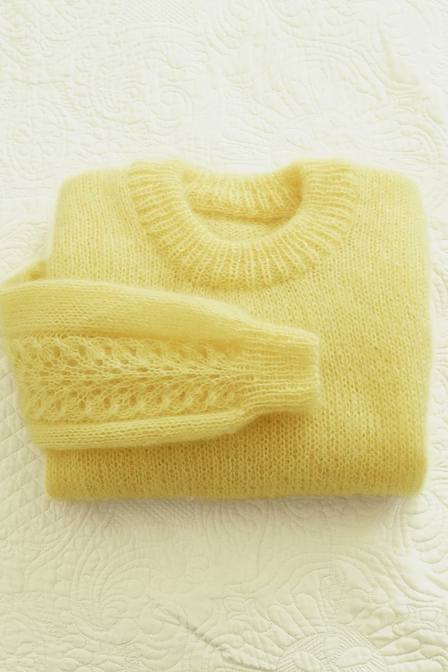 Otul się subtelną miękkością i lekkością natury. Ręcznie robiony sweter w odcieniu masełkowym powstał z wyjątkowej przędzy – delikatnego moheru z dodatkiem jedwabiu. To połączenie sprawia, że jest niezwykle miękki, lekki i przyjemny w dotyku.
