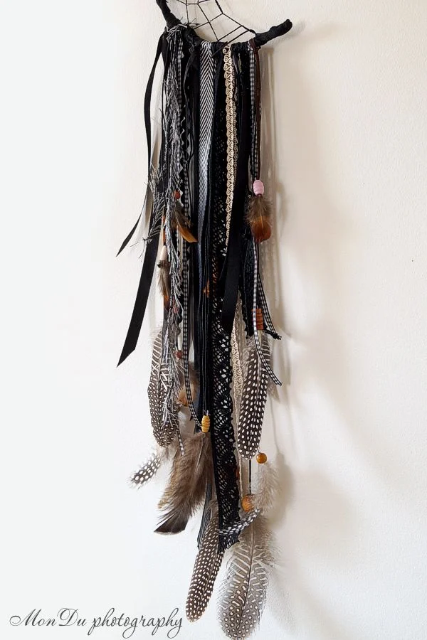 Ręcznie wykonany z dbałością o detale, łączy w sobie subtelność plecionego półksiężyca z delikatnością piór i ozdobnych elementów. Symbol księżyca dodaje mu głębokiej symboliki – wspiera intuicję, wyciszenie i spokojny sen.