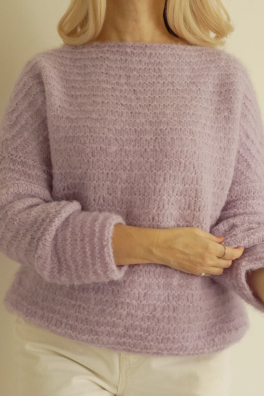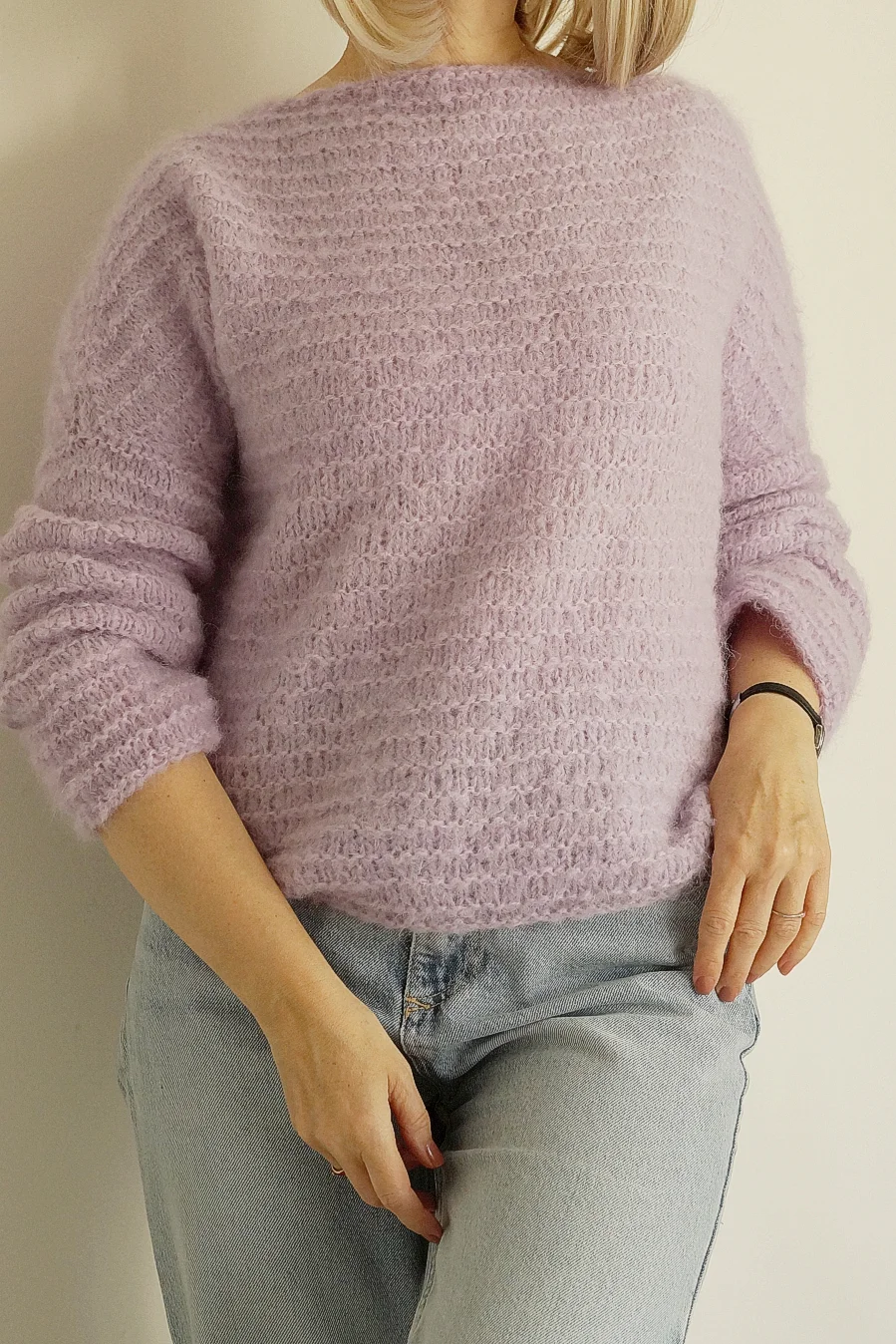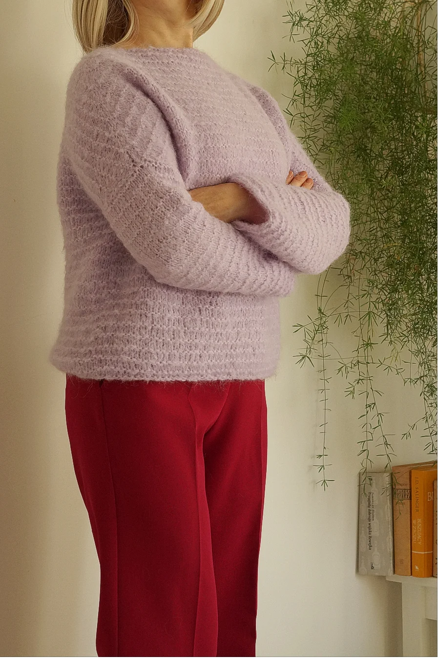 Odkryj wyjątkowy, liliowy sweter wykonany ręcznie na drutach z miękkiej i puszystej alpaki. Model zachwyca subtelnym kolorem oraz kobiecym dekoltem w łódkę, który pięknie podkreśla linię ramion. Sweter posiada obniżoną linię rękawa i średniej szerokości rękawy, dzięki czemu idealnie układa się pod płaszczem, zapewniając komfort i elegancję w chłodniejsze dni. To unikatowy element garderoby stworzony z naturalnych włókien, który doda stylu każdej stylizacji i będzie służył przez lata.