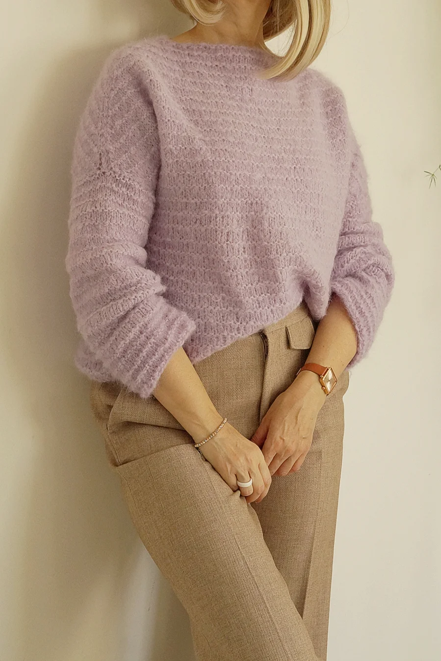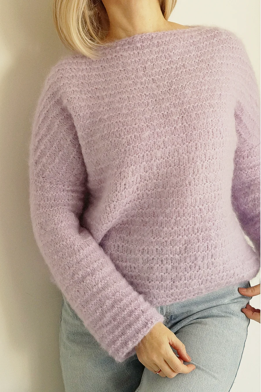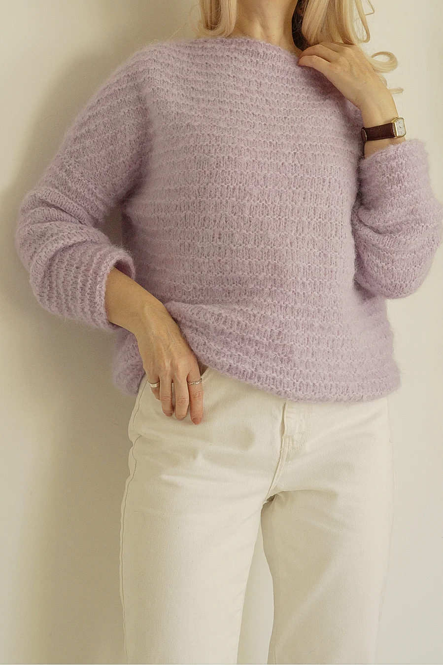 Odkryj wyjątkowy, liliowy sweter wykonany ręcznie na drutach z miękkiej i puszystej alpaki. Model zachwyca subtelnym kolorem oraz kobiecym dekoltem w łódkę, który pięknie podkreśla linię ramion. Sweter posiada obniżoną linię rękawa i średniej szerokości rękawy, dzięki czemu idealnie układa się pod płaszczem, zapewniając komfort i elegancję w chłodniejsze dni. To unikatowy element garderoby stworzony z naturalnych włókien, który doda stylu każdej stylizacji i będzie służył przez lata.