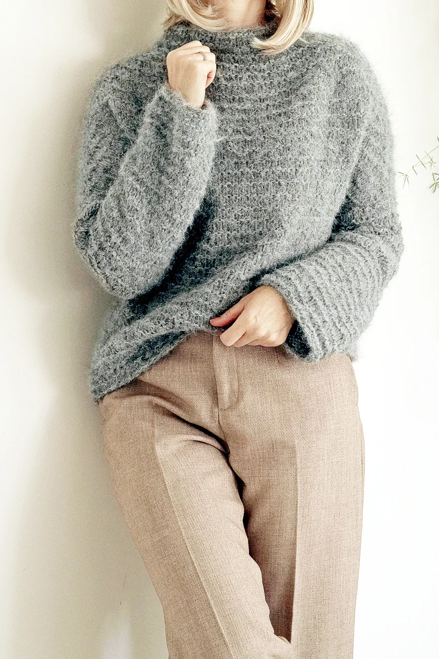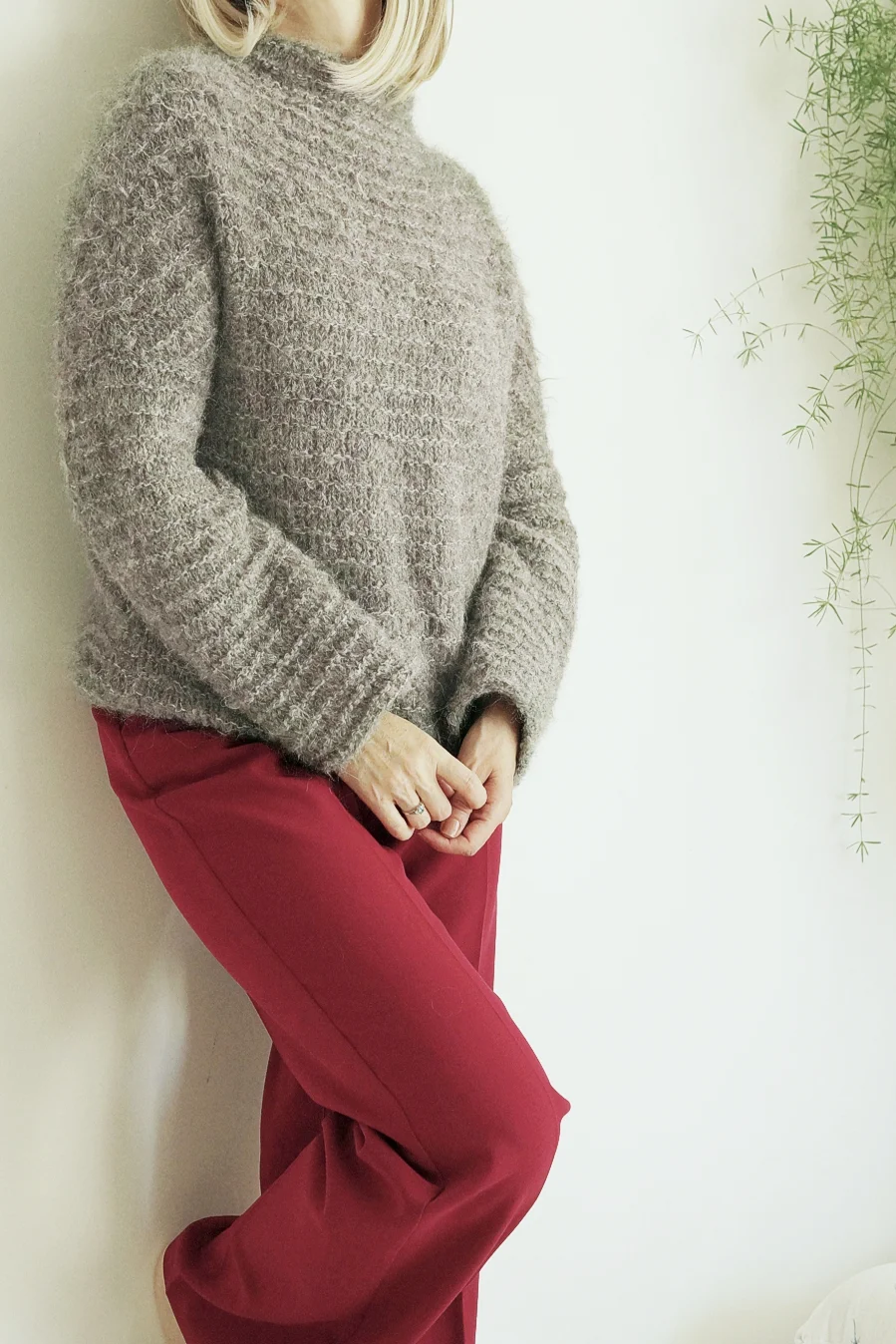 Miękki, ręcznie wykonany sweter z półgolfem to idealne połączenie komfortu i elegancji. Wykonany ręcznie z luksusowej, lekko włochatej włóczki z dużą przewagą alpaki, otula ciepłem i przyjemnie układa się na sylwetce. Obniżona linia rękawa nadaje mu nowoczesny, swobodny charakter, a dopracowany krój sprawia, że rękawy świetnie mieszczą się pod płaszczem, nie tworząc dodatkowej objętości. Subtelny, szary kolor podkreśla uniwersalność modelu – doskonały zarówno na co dzień, jak i na chłodniejsze, bardziej eleganckie wyjścia.