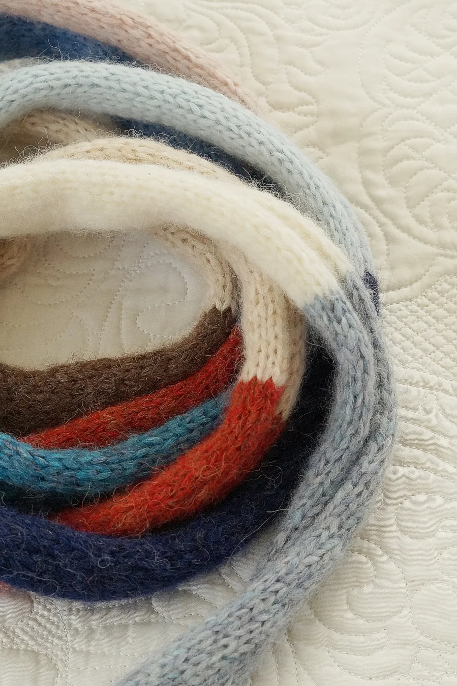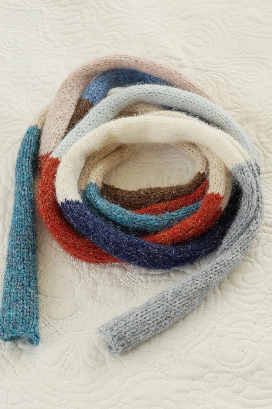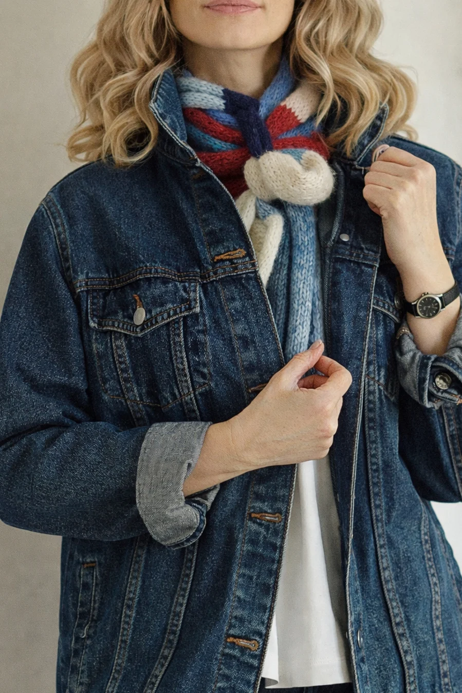 Długi cienki szalik to doskonały dodatek na wiosnę, gdy poranki i wieczory bywają jeszcze chłodne. Wykonany ręcznie na drutach z miękkiej, delikatnej włóczki. Dzięki swojej długości można go nosić na wiele sposobów w zależności od upodobań i wyobraźni. Subtelne połączenie kolorów doda stylizacji świeżości uzupełniając wiosenne płaszcze, kurtki czy lekkie swetry.