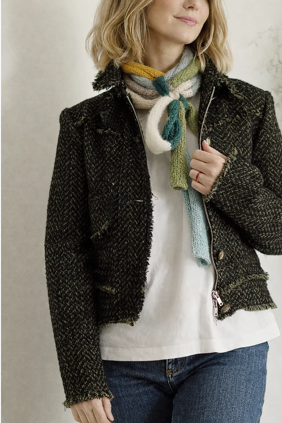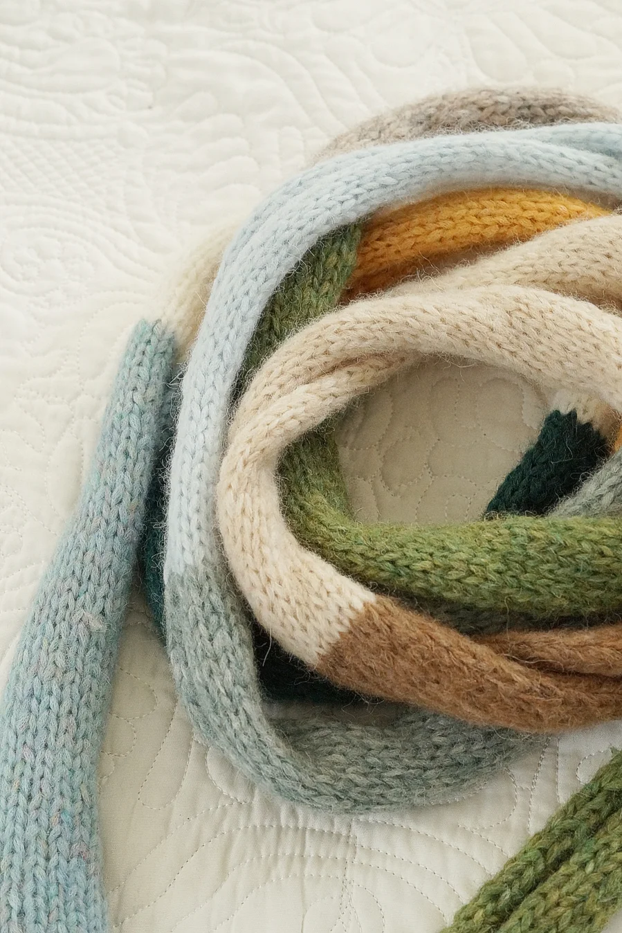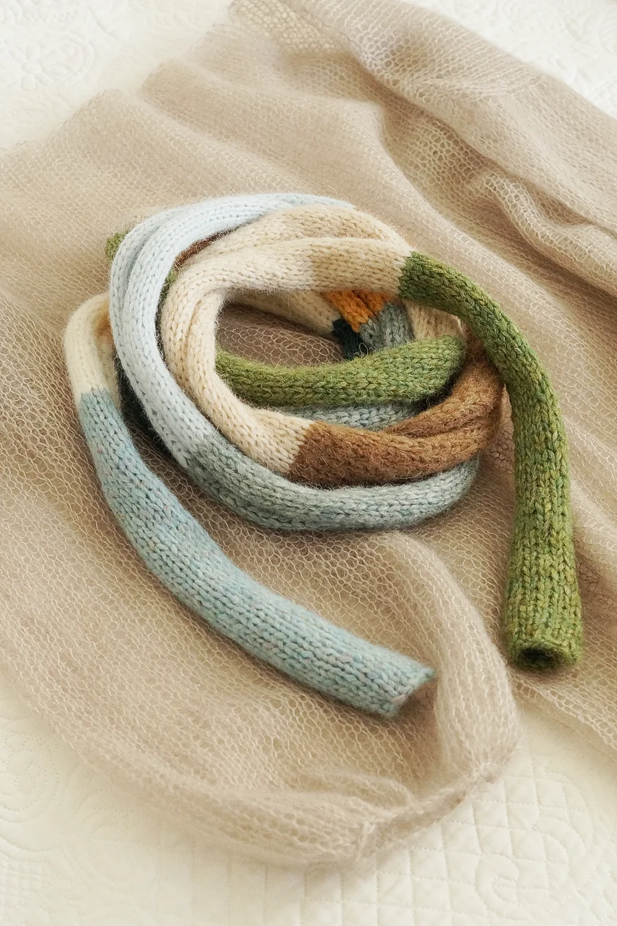 Długi cienki szalik to doskonały dodatek na wiosnę, gdy poranki i wieczory bywają jeszcze chłodne. Wykonany ręcznie na drutach z miękkiej, delikatnej włóczki. Dzięki swojej długości można go nosić na wiele sposobów w zależności od upodobań i wyobraźni. Subtelne połączenie kolorów uzupełni wiosenne stylizacje - do kurtki, płaszcza, swetra, T-shirta.