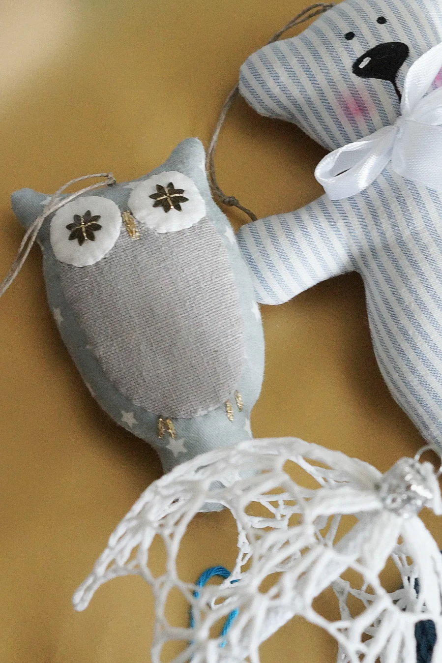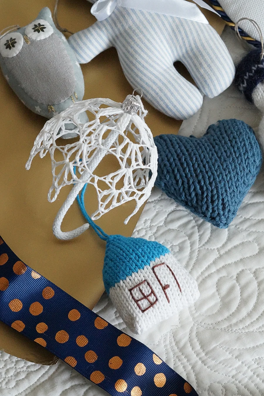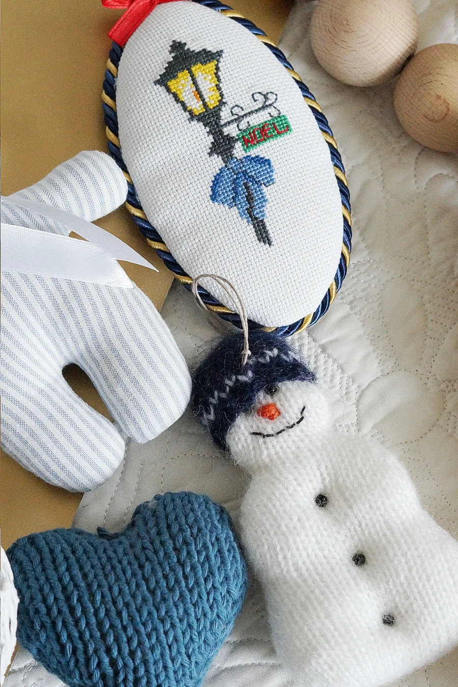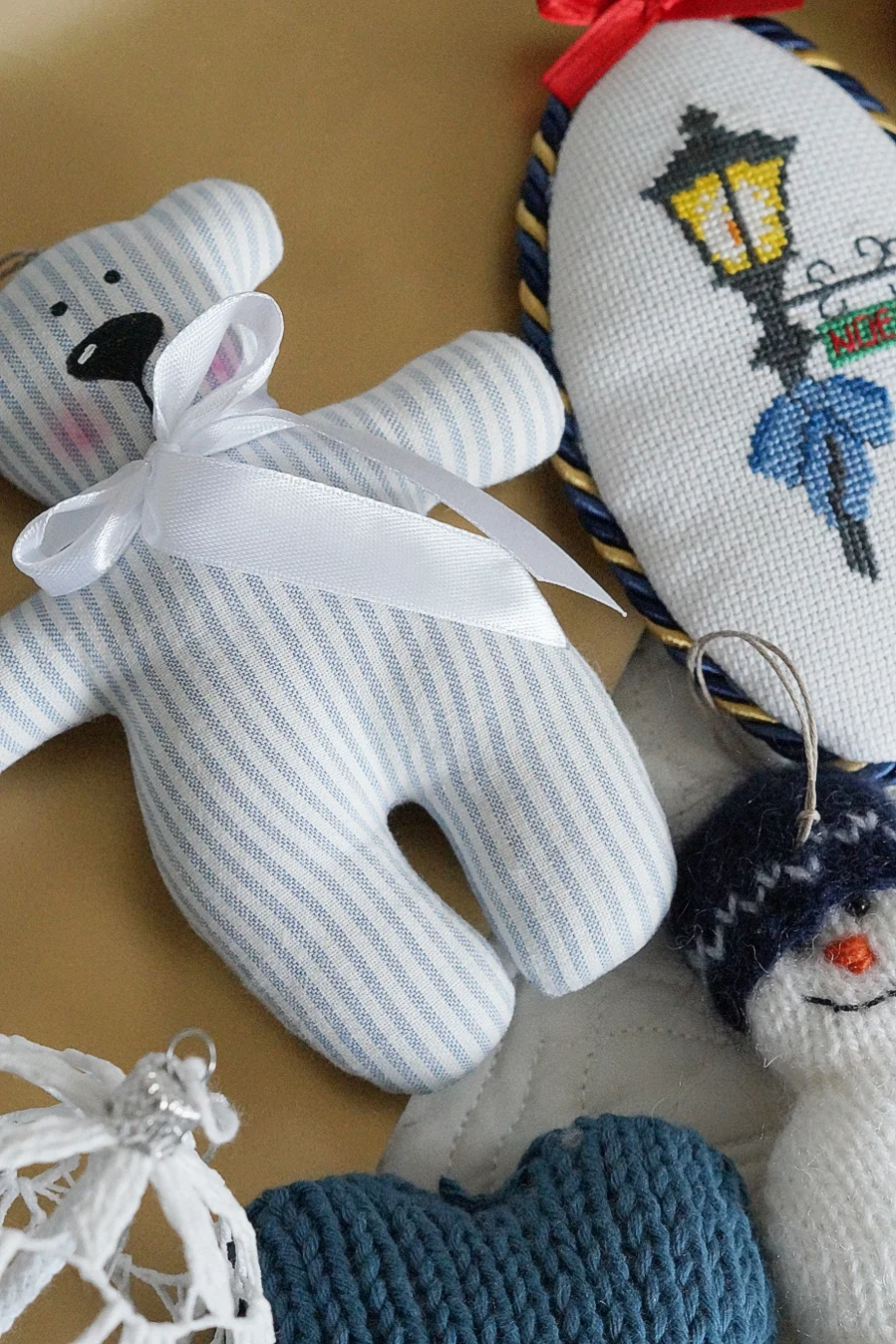 Zestaw składa się z siedmiu ozdób wykonanych różnymi technikami rękodzielniczymi: haft krzyżykowy, dzierganie, szydełkowanie, szycie: